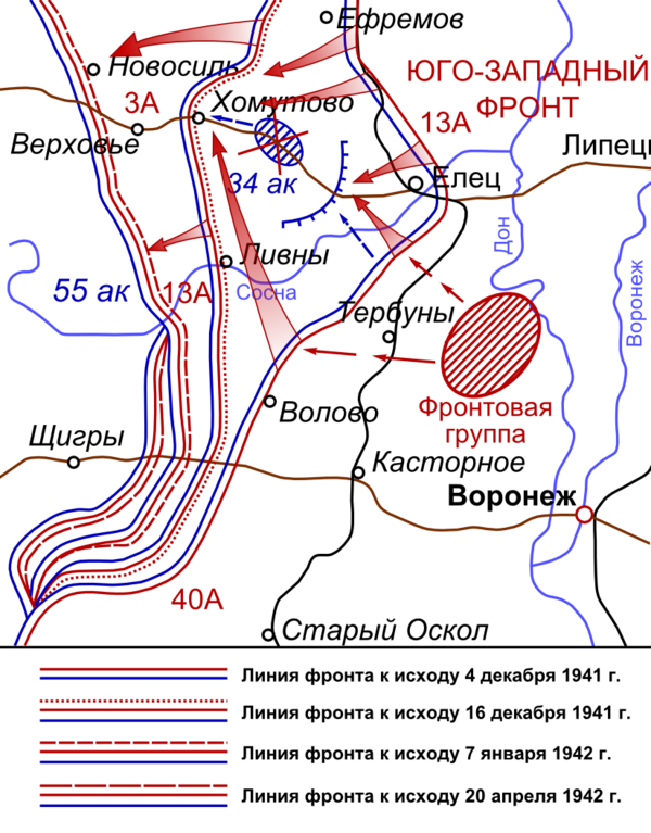 И. В. Сталин тогда с особым вниманием присматривался к району Воронежа. Возможно, он предполагал, что, прорвавшись сюда, немецкие войска форсируют Дон и начнут обходное движение в тыл Москвы. Стремясь упрочить положение на воронежском направлении, Ставка приказала выдвинуть на левый берег Дона три армии — 3, 6 и 5-ю резервные, которые были затем переименованы соответственно в 60, 6 и 63-ю армии. Они заняли оборону от Задонска до Клетской. Одновременно Брянскому фронту передавалась и только что сформированная 5-я танковая армия опытного и храброго генерала А. И. Лизюкова для контрудара но северному флангу противника, наступающего на Воронеж. Советское стратегическое руководство и Генеральный штаб полагали, что если начать контрудар без промедления, то эта армия совместно с 17-м танковым корпусом фронта сумеет изменить обстановку в нашу пользу. Кроме того, фронту передавался 18-й танковый корпус.