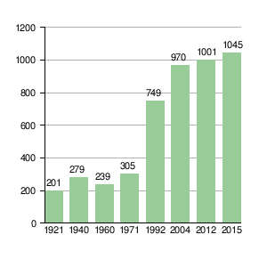 | 1921 | 1940 | 1960 | 1971 | 1992 | 1999 | 2004 | 2009[9] | 2012 | 2015 |