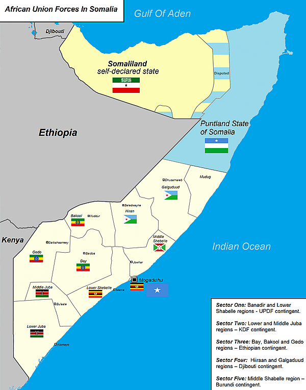 К 2020 году миротворческий контингент состоял из войск, привлеченных из Уганды, Бурунди, Джибути, Кении и Эфиопии, которые были развернуты в шести секторах, охватывающих юг и центр Сомали. Они ведут бои с группировкой «Аш-Шабааб»[6].