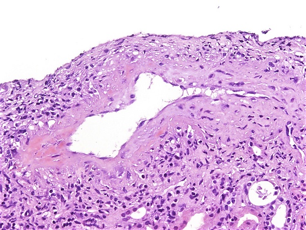 Гистологическое исследование биоптата почки: наиболее типичным является очаговый сегментарный фибриноидный некроз с разрушением базальной мембраны клубочка. Параллельно наблюдается экстракапиллярная пролиферация с образованием клеточных и фиброзно-клеточных полулуний в пространстве Боумена — Шумлянского, которые состоят из скоплений макрофагов и эпителиальных клеток. В просветах поражённых капиллярных петель часто обнаруживаются ядерный детрит и фибриновые тромбы. Активное воспаление вокруг клубочка может приводить к разрыву капсулы Боумена, иногда с формированием перигломерулярной гранулёматозной реакции. При этом для картины не характерна эндотелиальная пролиферация, типичная для иммунокомплексных ГН. В интерстиции наблюдается воспалительный инфильтрат различной интенсивности, состоящий преимущественно из лимфоцитов, гистиоцитов, плазматических клеток и иногда значительного количества эозинофилов. Васкулит поражает мелкие артерии, артериолы, капилляры и венулы, часто проявляясь как лейкоцитокластический васкулит с фибриноидным некрозом и нейтрофильной инфильтрацией. В мозговом веществе может развиваться некротизирующий васкулит сосудов прямых канальцев, что ассоциировано с интерстициальным кровоизлиянием и нейтрофильным воспаление почечных канальцев[7].