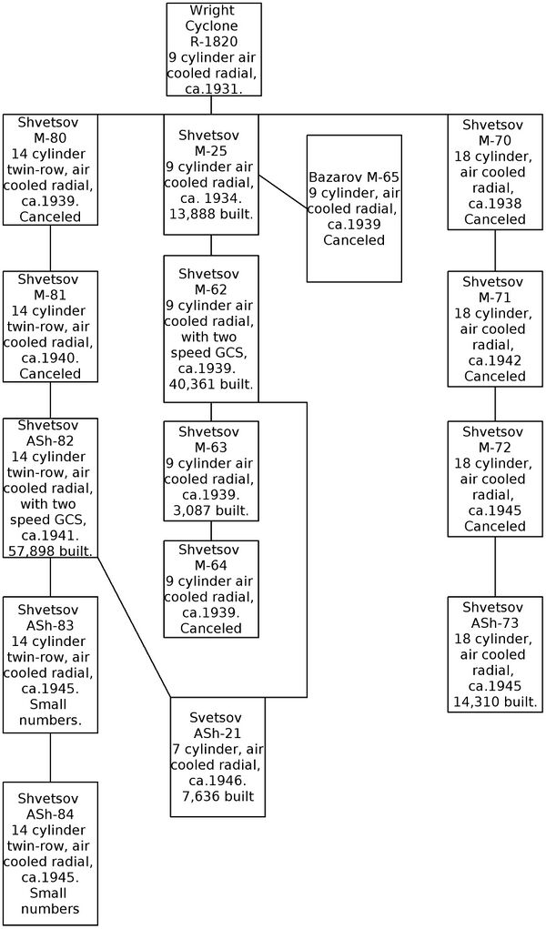 Освоенная в массовом производстве цилиндропоршневая группа этого мотора в дальнейшем использовалась в двухрядных двигателях АШ-73 для Ту-4 и Бе-6, а с укорочением хода поршней в имеющем существенно меньший диаметр, а потому обеспечивающем лучшие аэродинамические свойства двухрядном двигателе АШ-82, на основе которого были построены массовые самолёты Ла-5, Ла-7, Ту-2, Ил-12, Ил-14.