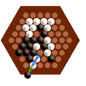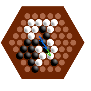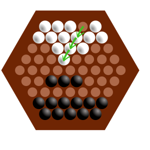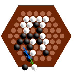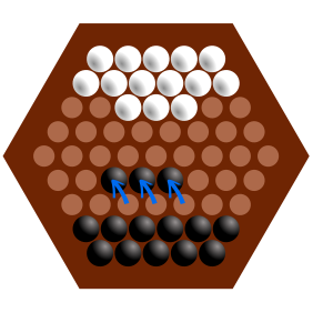 - Фронтальное перемещение: все шары перемещаются параллельно, в направлении, не совпадающем с линией, на которой стоит группа, не меняя положения относительно друг друга. При этом каждый шар группы переходит на соседнюю с ним свободную лунку (см. иллюстрацию ниже, первый ход). Для фронтального перемещения необходимо, чтобы все лунки, на которые перемещаются шары группы, были пусты.