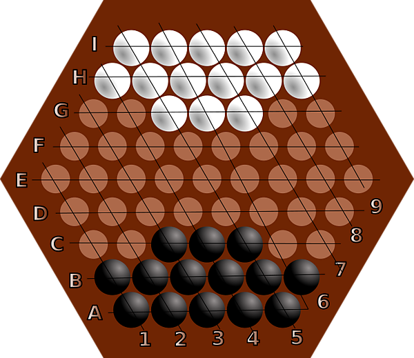 - горизонтальные линии игрового поля обозначаются снизу вверх (от позиции чёрных) латинскими буквами от A до I;