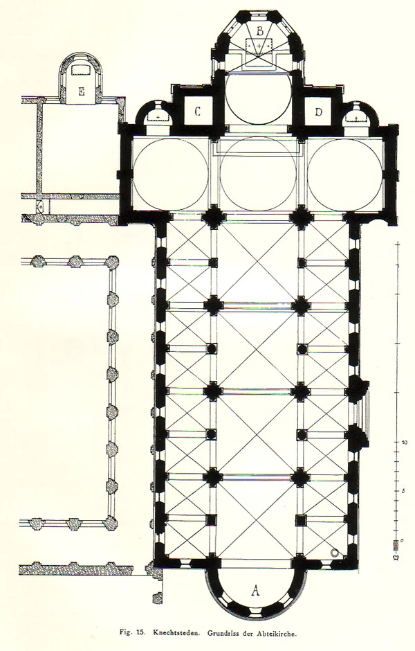 Восточная часть базилики с её высокими стрельчатыми светлыми окнами напоминает о том, что это сравнительно новая, готическая часть храма. Романские алтарные части храмов выглядят иначе. В Кнехтштедене базилика демонстрирует оба стилевых варианта архитектуры.
