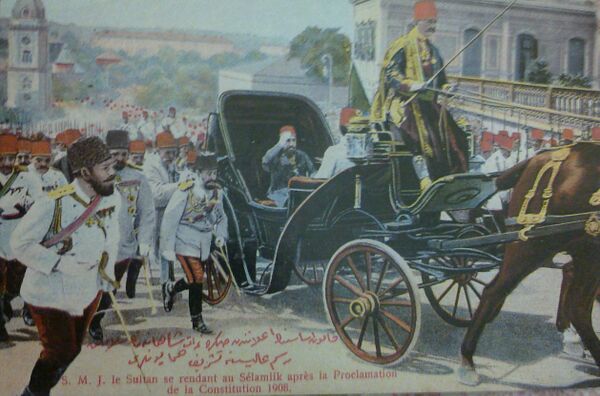 Первое известие о начале бунта в войсках относится к июню 1908 года, когда македонские войска открыто заявили себя сторонниками младотурок, и посланный султаном в Салоники Осман-паша с чрезвычайными полномочиями для усмирения военного мятежа был арестован младотурками. Когда Абдул-Хамид убедился, что единственная опора его трона, армия, открыто стала против него, что по распоряжению революционного комитета из Константинополя удалена его гвардия, он понял, что дальнейшее сопротивление невозможно. Тогда, 10 июля 1908 г., оттоманское правительство опубликовало, что «Его Величество султан припомнил, что конституция 1876 г. представляет собою одно из славнейших его созданий и приказал вновь ввести её в действие». На 4 декабря было назначено открытие нового турецкого парламента. В этот день Абдул-Хамид впервые с 1878 г. выехал из своего дворца и в открытом экипаже проследовал по всему городу в здание парламента, где ещё раз обещал свято хранить основные законы империи. Хотя Абдул-Хамид в первое время исполнял все требования младотурок, однако центральный комитет не прекратил свою деятельность, и в Турции появилось 2 правительства: министерство — в столице и комитет — в Салониках.