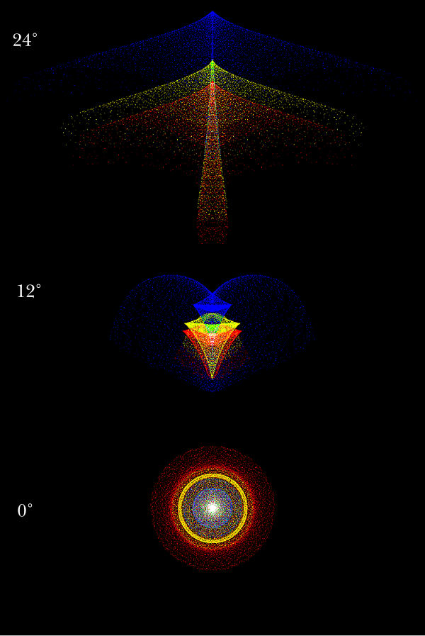Как правило, картину распределения лучей в фигурах рассеяния заметно осложняет то, что на комбинацию всех аберраций третьего порядка налагаются аберрации высших порядков. Это распределение заметно меняется с изменением положения точки объекта и отверстия системы. Так например, сферическая аберрация пятого порядка, в отличие от сферической аберрации третьего порядка, отсутствует в точке на оптической оси, но при этом растёт пропорционально квадрату удаления от неё.