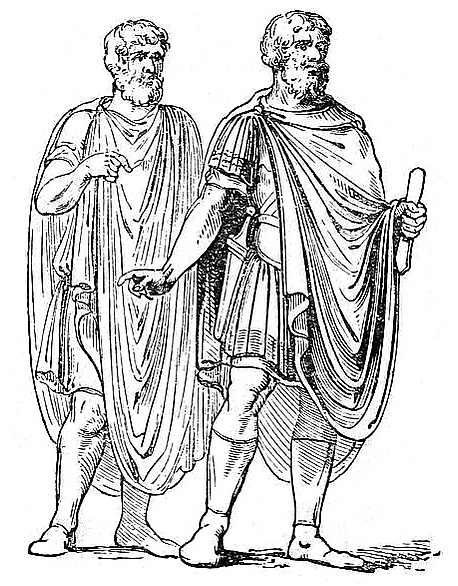 Двойной плащ по колено, бывший в употреблении у римлян. Он держался на плечах с помощью фибулы, захватывавшей оба верхних края ткани, в развёрнутом виде имевшей форму неправильного четырёхугольника[2].