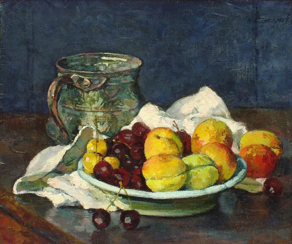 На картине изображена белая тарелка с абрикосами и черешнями, размещённая на переднем плане. За тарелкой располагается белая драпировка, а рядом — металлический кувшин. Композиция подчёркивает характерные для натюрморта сочетания предметов и фактур.