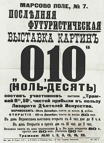 В декабре 1915 года в Петрограде открылась выставка «0,10» (НОЛЬ-ДЕСЯТЬ). На этой выставке была выставлена картина Казимира Малевича «Чёрный квадрат».