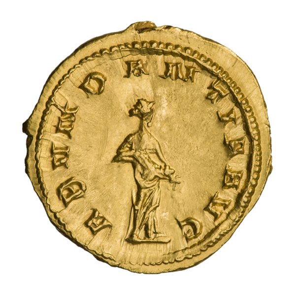 Впервые Абунданция явно появилась на монетах Гелиогабала (218—222) с легендой «ABVNDANTIA AVG»[9][12]. Выпуск денег с богиней изобилия могли приурочивать к раздачам дешёвого зерна[4]. Таким образом официальная пропаганда подчёркивала щедрость императора, выражавшуюся в раздаче народу части государственных запасов[13]. Часто она фигурирует с эпитетами «AVG[usti]», «TEMPERORVM» («Августа», «времени»)[14][15][10].