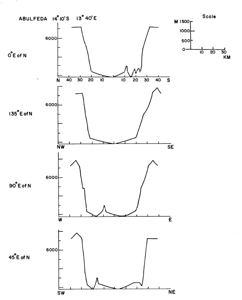 На приведённом графике представлено сечение кратера в различных направлениях[6], масштаб по оси ординат указан в футах, масштаб в метрах указан в верхней правой части иллюстрации.