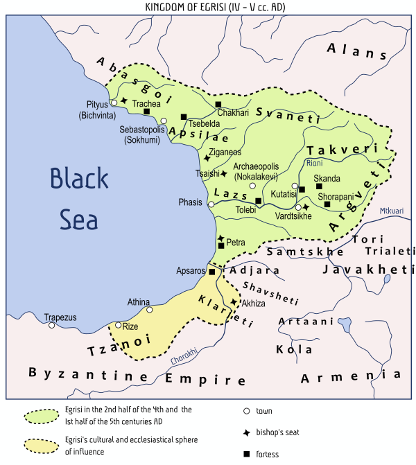В IV и V веках Абасгия была подчинена Лазике[39]. В IV веке христианство уже было распространено в Абхазии, епископ Питиунта принимал участие в Первом Никейском соборе (325 год)[38]. К VI веку Абасгия (между реками Гумиста и Бзыбь со столицей в Анакопии) была подчинена Восточной Римской империи[39]. В первой половине VI века христианство становится официальной религией; строятся христианские храмы, появляется Абазгийская архиепископия в составе Константинопольской патриархии, имевшая кафедру в Себастополисе. В конце VII — начале VIII веков абхазское побережье подвергалось арабским набегам. При Леоне II в конце VIII века Абхазия добилась независимости от Византии. Возникло Абхазское царство, его территория распространялась на всю Западную Грузию. Население царства состояло из абхазов и картвельских племен (грузины), последние согласно З. В. Анчабадзе составляли значительное большинство[40]. Столица первоначально находилась в Анакопии (Новый Афон), а в 806 году переместилась в Кутаиси[38], византийское культурное влияние сменяется грузинским. В VIII веке формируется самостоятельны Абхазский католикосат. В Абхазском царстве существовали многочисленные города, крепости и храмы. Население вело торговлю с соседними государствами, странами Ближнего Востока и Средиземноморья. После пресечения в 975 году местной династии власть перешла к Багратионам, которые смогли объединить различные грузинские царства в единое государство. До XV века Абхазия находилась в составе единого Грузинского царства. Значительными памятниками культуры средневековой Абхазии являются храмы в Бедиа, Илори, Мокви, цитадель Баграта, Келасурская стена, Анакопийская крепость и т. д. В 1240-х годах монголы разделили Грузию на восемь военно-административных секторов, территория современной Абхазии составляла часть Думана, управляемого Цотне Дадиани. Позже Цхуми (Сухуми) служил столицей правителей Мингрелии, именно в этом городе Вамек I (ок. 1384-1396), самый влиятельный Дадиани, чеканил свои монеты.