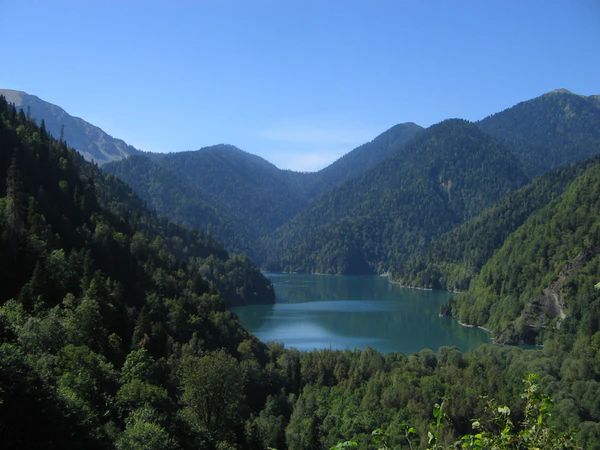 Реки сравнительно коротки, все они принадлежат бассейну Чёрного моря[32]. Наиболее значительные из них (Кодор (Кудры), Бзыбь, Кяласур, Гумиста) многоводны, потенциальные гидроэнергетические ресурсы превышают 3,5 млн кВт. Питание рек преимущественно дождевое и снеговое, имеет место весенне-летнее половодье. На территории Гагрского района протекает самая короткая в мире[33][34] река Репруа — её длина всего 18 м. В горах расположены живописные озёра Рица и Амткел.
