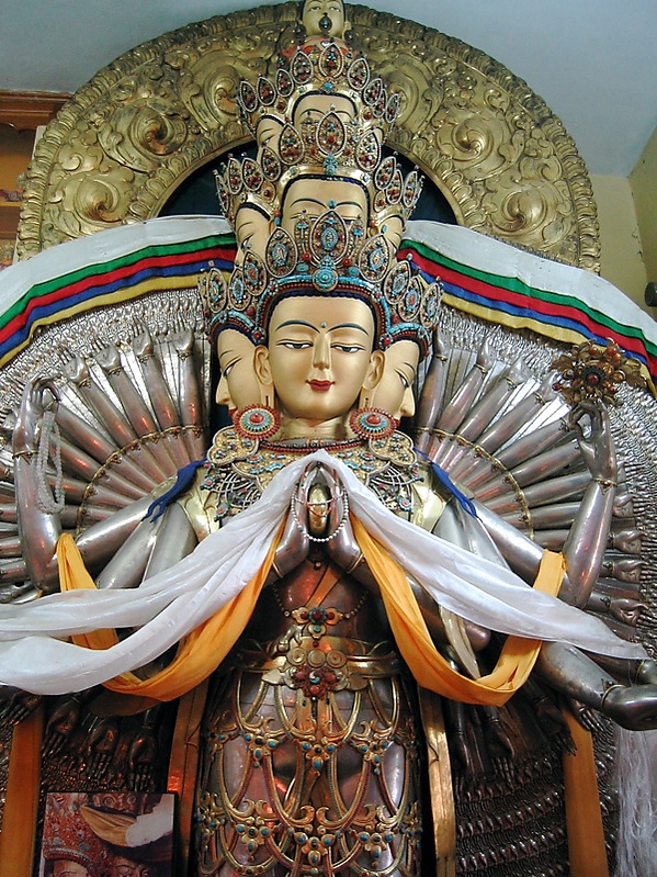 Будда Амитабха и бодхисаттва Ваджрапани, видя это, восстановили тогда тело Авалокитешвары, придав ему новую форму с тысячью руками и одиннадцатью головами, в таком виде Великий Сострадающий стал очень мощным.