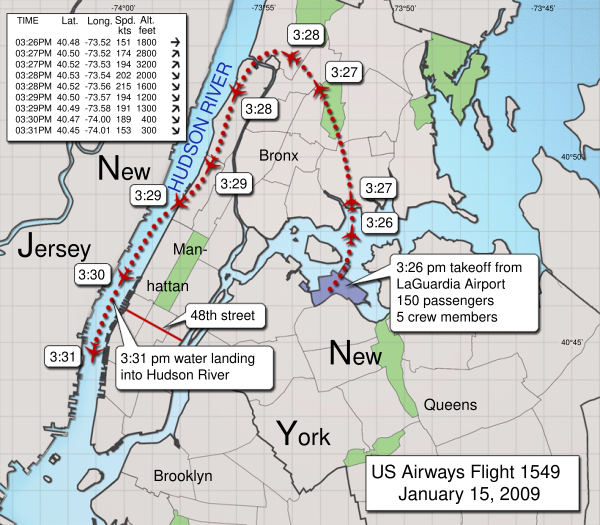 Пилотам удалось развернуть лайнер, взлетавший на север, на юг, спланировать над рекой Гудзон, не задев мост Джорджа Вашингтона, и в 15:30:43 EST приводнить рейс AWE 1549 напротив 48-й улицы Манхэттена, при этом не разрушив тяжёлый заправленный самолёт. Окончательно он остановился напротив 42-й улицы. Всего самолёт пробыл в воздухе (с момента взлёта до приводнения) около 7 минут.