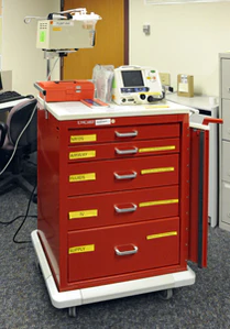 Состав и организация аварийной тележки различаются от больницы к больнице, от страны к стране и по специальности, однако типично в неё входят инструменты и препараты, необходимые для оказания помощи человеку с остановкой сердца или другой жизнеугрожающей патологией.[1][2][3] Примерный перечень включает: