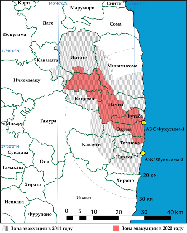 Следствием мероприятий по защите населения от последствий радиационной аварии стало установление в 2011 году зоны эвакуации вокруг АЭС Фукусима-дайити, где прогнозируемое облучение населения могло превысить 20 мЗв за год. Эта зона включала в себя территории в радиусе 20 км от станции, а также земли, попавшие в область «северо-западного» следа выброса[219]. Общая площадь зоны эвакуации, затронувшей одиннадцать муниципалитетов, составила около 1150 км²[220]. В дальнейшем, в зависимости от уровня загрязнения, эти территории были разделены на три зоны. Первые — это так называемые «области, возвращение в которые будет затруднено», где прогнозируемая доза облучения не снизится за пять лет ниже 20 мЗв/год или уже превышает 50 мЗв/год. Вторые — области с запретом на проживание, в которых прогнозируемая доза выше 20 мЗв за год, но в которых будут систематически проводиться восстановительные работы. Наконец, третью зону составляют области, в которых будет вестись подготовка к возвращению жителей и в которых, по состоянию на декабрь 2011 года, прогнозируемая доза облучения находится ниже границы в 20 мЗв/год[221]. Согласно принятым решениям правительства Японии, отмена приказов об эвакуации возможна при выполнении ряда условий. Во-первых, получаемая населением годовая эффективная доза облучения должна быть снижена ниже 20 мЗв. Во-вторых, должна быть восстановлена инфраструктура, необходимая для постоянного проживания. И в-третьих, администрация префектуры, муниципалитетов и жители должны быть соответствующим образом проконсультированы[221].