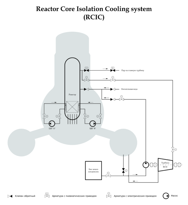 Как ни удивительно, система RCIC второго энергоблока до тех пор работала без какого-либо электропитания, однако её производительность падала. Ранее, 12 марта в 04:00, из-за исчерпания запасов конденсата, который закачивался в реактор насосом RCIC, водозабор системы переключили на камеру конденсации контейнмента Mark-I (форма резервуара — тор). Циркуляция теплоносителя через реактор стала проходить по замкнутому контуру, и вся система постепенно нагревалась. Около 13:25 14 марта уровень теплоносителя в реакторе второго блока снизился, и имелись все признаки того, что система RCIC остановлена[87].