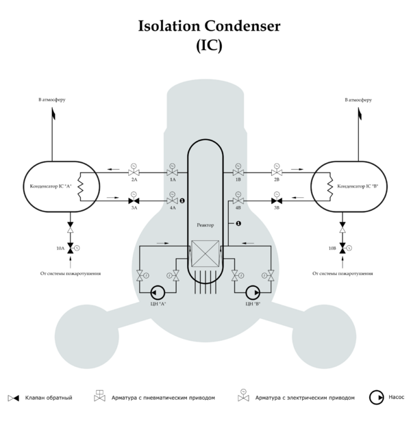 Изначально наиболее тяжёлое положение сложилось на блоке № 1, однако это далеко не сразу было осознано. До прихода цунами отвод теплоты остаточного энерговыделения от реактора осуществлялся при помощи двух независимых конденсаторов режима изоляции (Isolation Condencer — IC)[19]. Система IC способна охлаждать реактор в течение примерно 10 часов за счёт естественной циркуляции теплоносителя. При работе системы пар от реактора проходит по теплообменным трубкам, расположенным под водой в баке конденсатора, где, охлаждаясь, конденсируется, и конденсат сливается обратно в реактор. Чистая вода из бака постепенно выкипает, и пар сбрасывается в атмосферу. При работе система не потребляет электроэнергию, однако для запуска циркуляции необходимо открыть электроприводную арматуру[20]. Так как инструкциями ограничивается скорость охлаждения реактора, операторы практически сразу отключили один конденсатор и до прихода цунами несколько раз запускали и останавливали второй[21]. После потери электропитания и, соответственно, индикации на панели управления персонал не смог однозначно определить состояние системы[18].