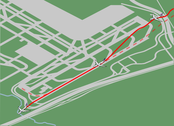 - Самолёт приземлился примерно в 1158 метрах от порога ВПП №24L, когда осталось около 1554 метра полосы, доступной для остановки. Самолет выкатился за пределы полосы №24L на скорости около 148 км/ч и был уничтожен пожаром, когда скатился в овраг.