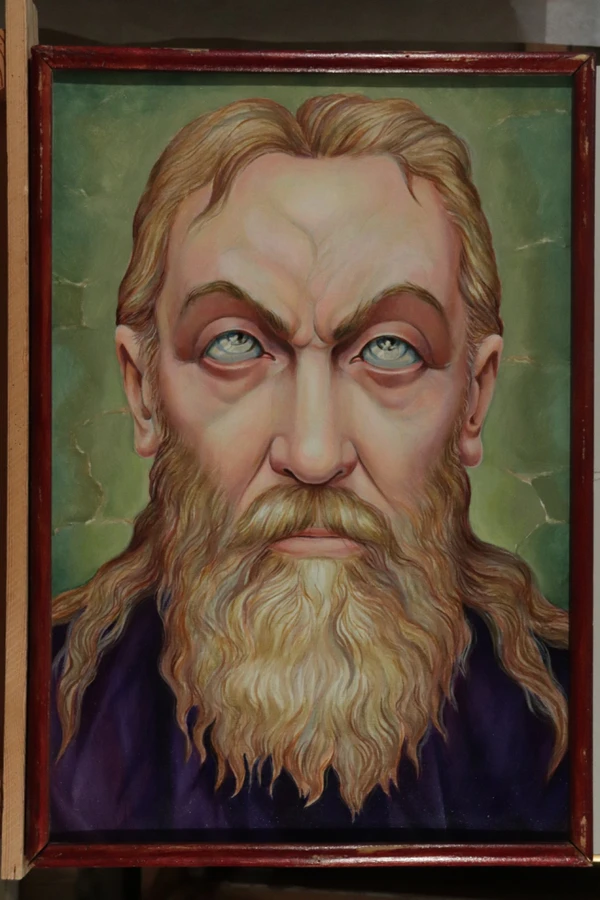 Работа представляет собой портрет мужчины с русыми волосами, бородой и усами, изображённого крупным планом в фас. Отличительными чертами являются высокий лоб с глубокими морщинами на переносице и светло-голубые глаза, взгляд которых направлен вверх. Фигура одета в фиолетовую одежду, на фоне преобладает зелёный цвет.