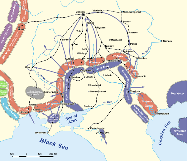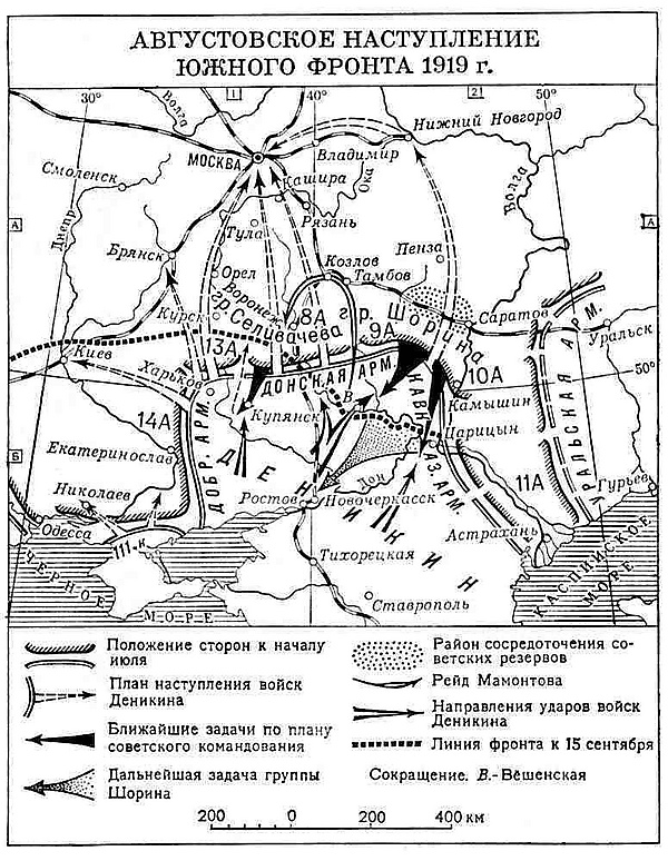 3 июля 1919 года А. И. Деникин издал директиву о наступлении на Москву, запланировав нанесение главного удара Добровольческой армии через Курск, Орёл, Тулу. Войска Красной армии вели оборонительные бои в полосе около 1400 км и к началу августа смогли остановить наступление белых на рубеже Ново-Украинка, Ромодан, Обоянь, Лиски, Борисоглебск, севернее Камышина, Владимировка, Чёрный Яр. После этого красные войска начали готовиться к переходу в контрнаступление[1].