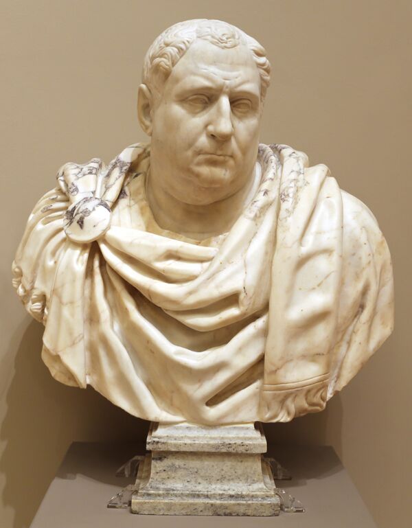 Светоний сообщает, что Авл Вителлий был «огромного роста», с большим животом и красным от пьянства лицом. Прислуживая на скачках Калигуле, будущий император сильно ушиб бедро о колесницу, и последствия этой травмы сохранились на всю жизнь[31]. Сохранились бюсты Вителлия и изображения на монетах, но они дают недостаточно материала, чтобы проверить слова Светония: ясно только, что в конце жизни Авл был полнолицым мужчиной с толстой шеей[143].