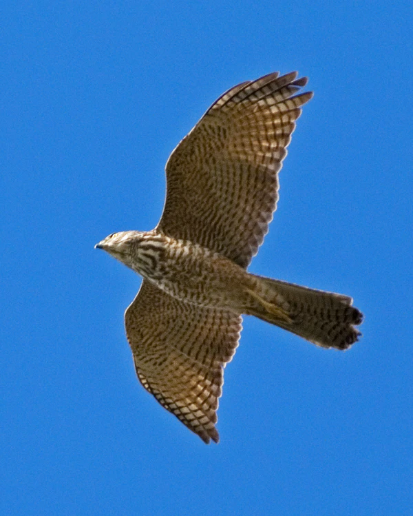 Верхняя часть тела и боковые стороны головы сланцево-серые, у самок оттенок несколько более бурый. На затылке проходит буроватая полоса, хвостовое оперение сверху очень тонко буро-перепоясано. Нижняя часть тела рыжевато-бурая с белыми поперечными полосами. Подбородок и горло светлее боковых сторон головы и тонко тёмно-серыми штрихами. Хвостовое оперение снизу серебристо-серое с тонкими тёмными поперечными полосами, которые отсутствуют только на внешних рулевых перьях. Клюв чёрный, восковица зеленовато-жёлтая. Радужка жёлтая до оранжево-жёлтой.