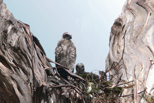 Оба родителя защищают гнездовой участок радиусом около 200–300 м вокруг гнезда. Минимальное расстояние между гнёздами австралийского бурого ястреба, по наблюдениям в штате Новый Южный Уэльс, составляет около одного километра. Неоднократно наблюдались пары, защищавшие один и тот же участок четыре-пять сезонов подряд. Самка считается более агрессивной защитницей[10]. Гнездо защищается, в том числе, от чёрного коршуна, клинохвостого орла, сапсана и орла-канюка. В одном случае орёл-канюк был преследован более километра после вторжения в гнездовой участок[11].