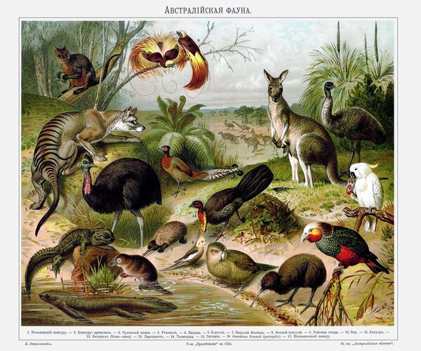 Неповторимое своеобразие животного мира Австралии и прилегающих островов позволяет выделить её в особую Австралийскую зоогеографическую область. Известно всего 235[12] видов млекопитающих, 974[13] — птиц, 420 — рептилий и 120 видов амфибий, обитающих на этом континенте и прилегающих островах. 83 % млекопитающих, 89 % рептилий, 90 % рыб и насекомых и 93 % амфибий являются эндемиками для Австралии.