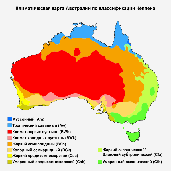 Австралийский континент расположен в пределах трёх основных тёплых климатических поясов Южного полушария: субэкваториального (на севере), тропического (в центральной части), субтропического (на юге). Только небольшая часть острова Тасмания находится в пределах умеренного пояса.