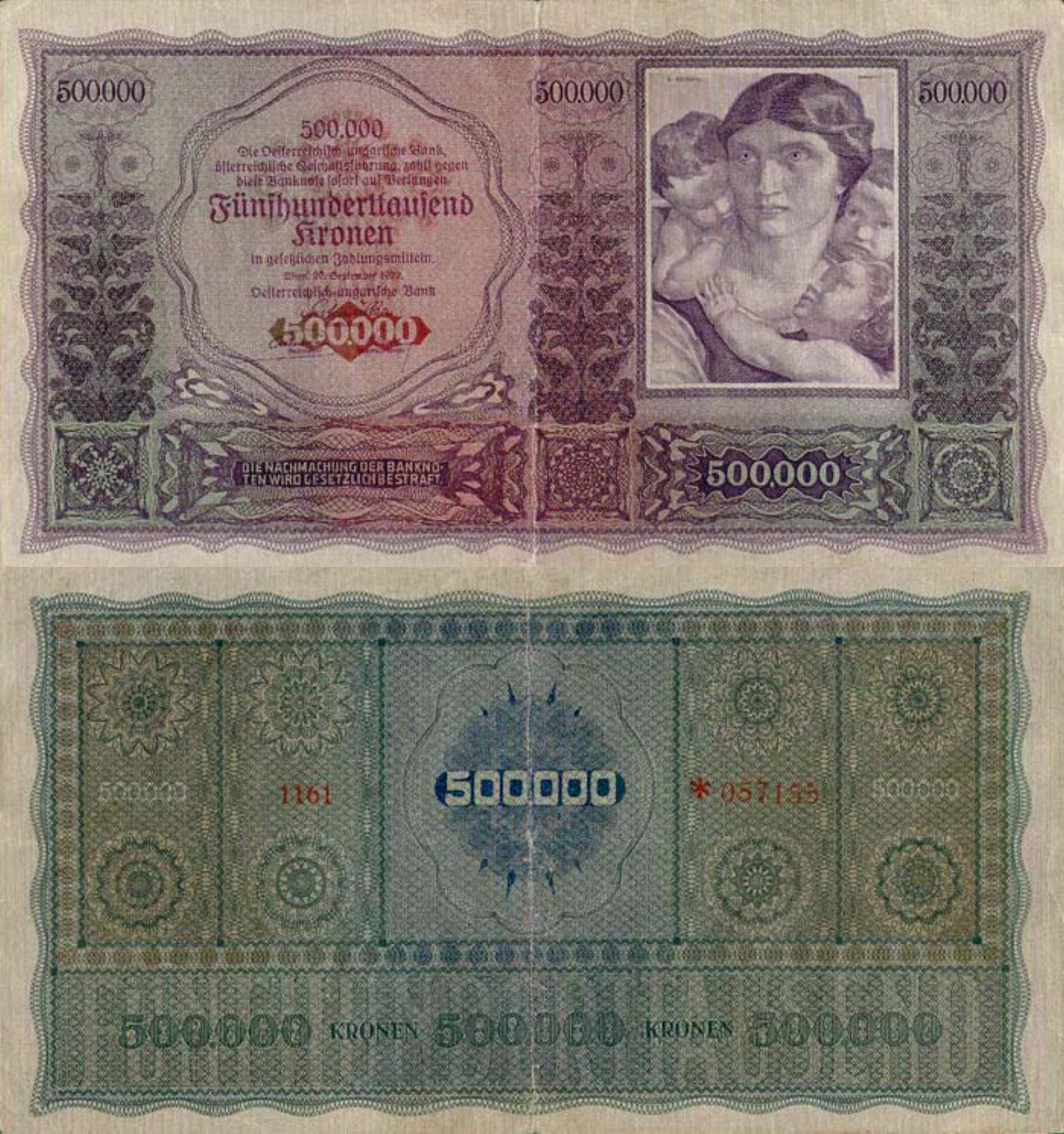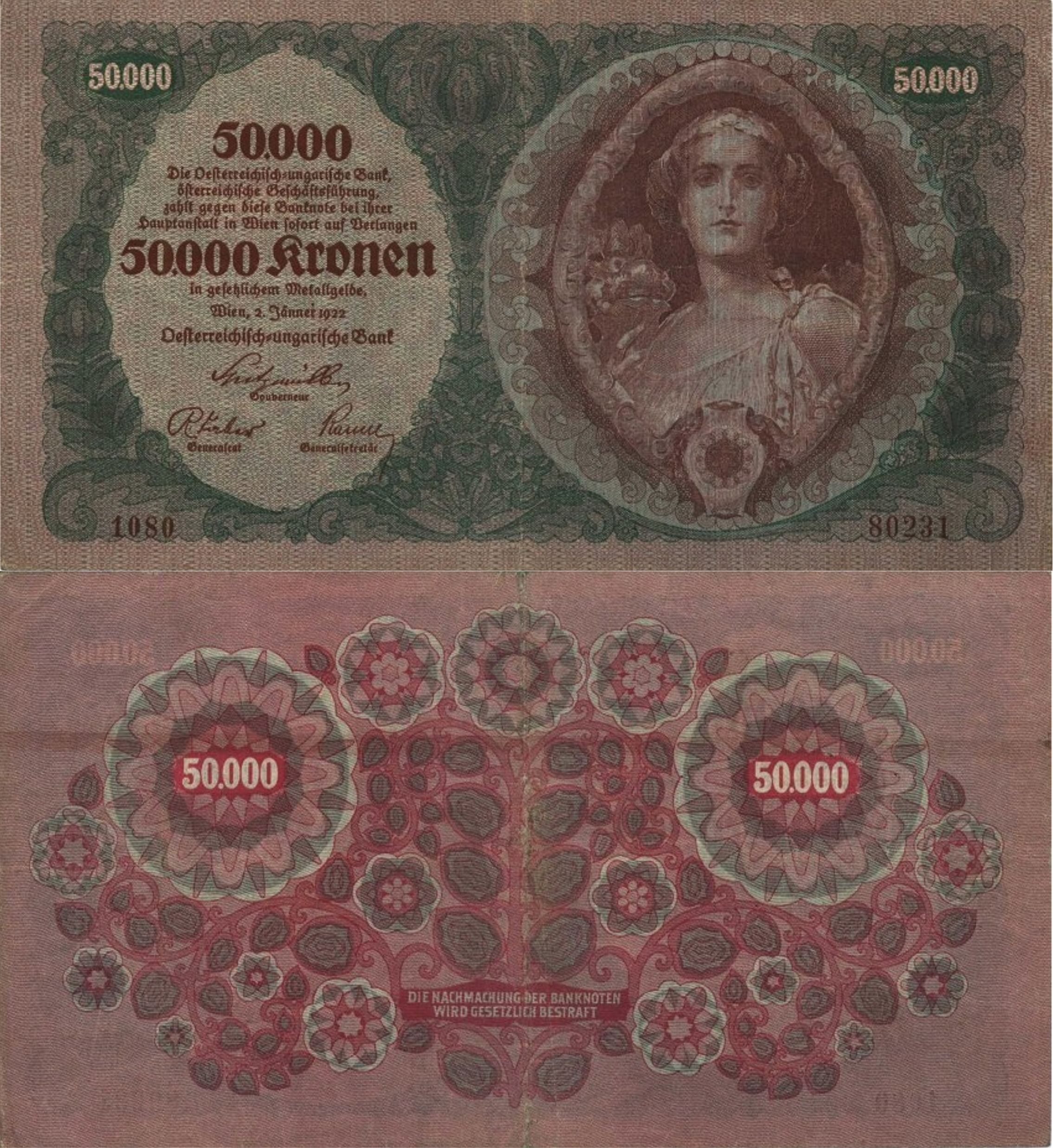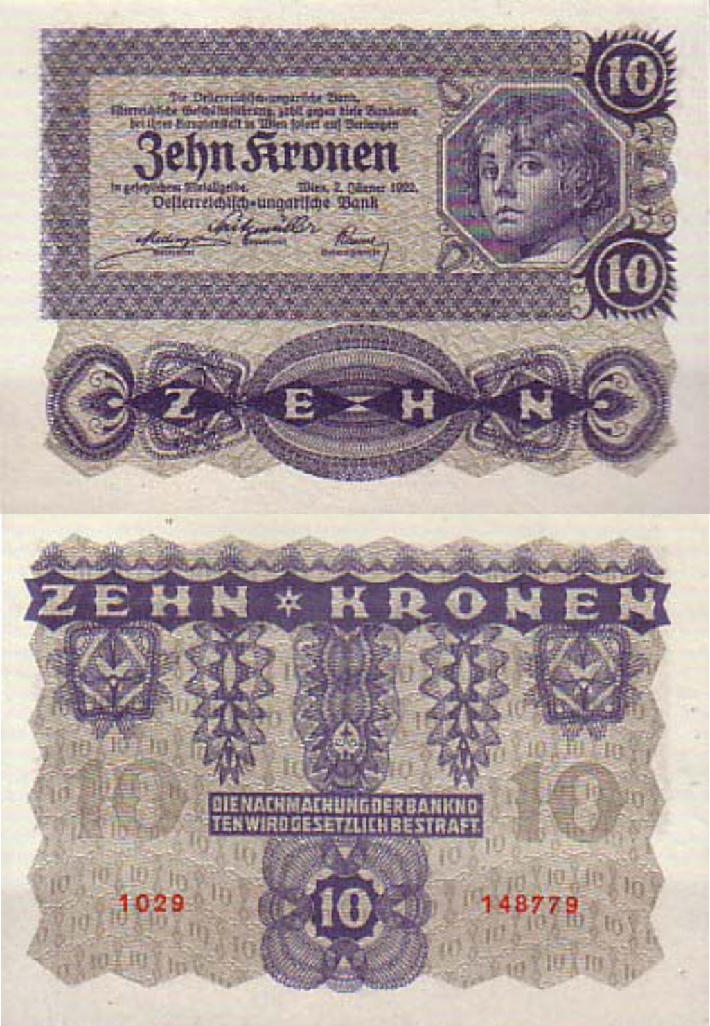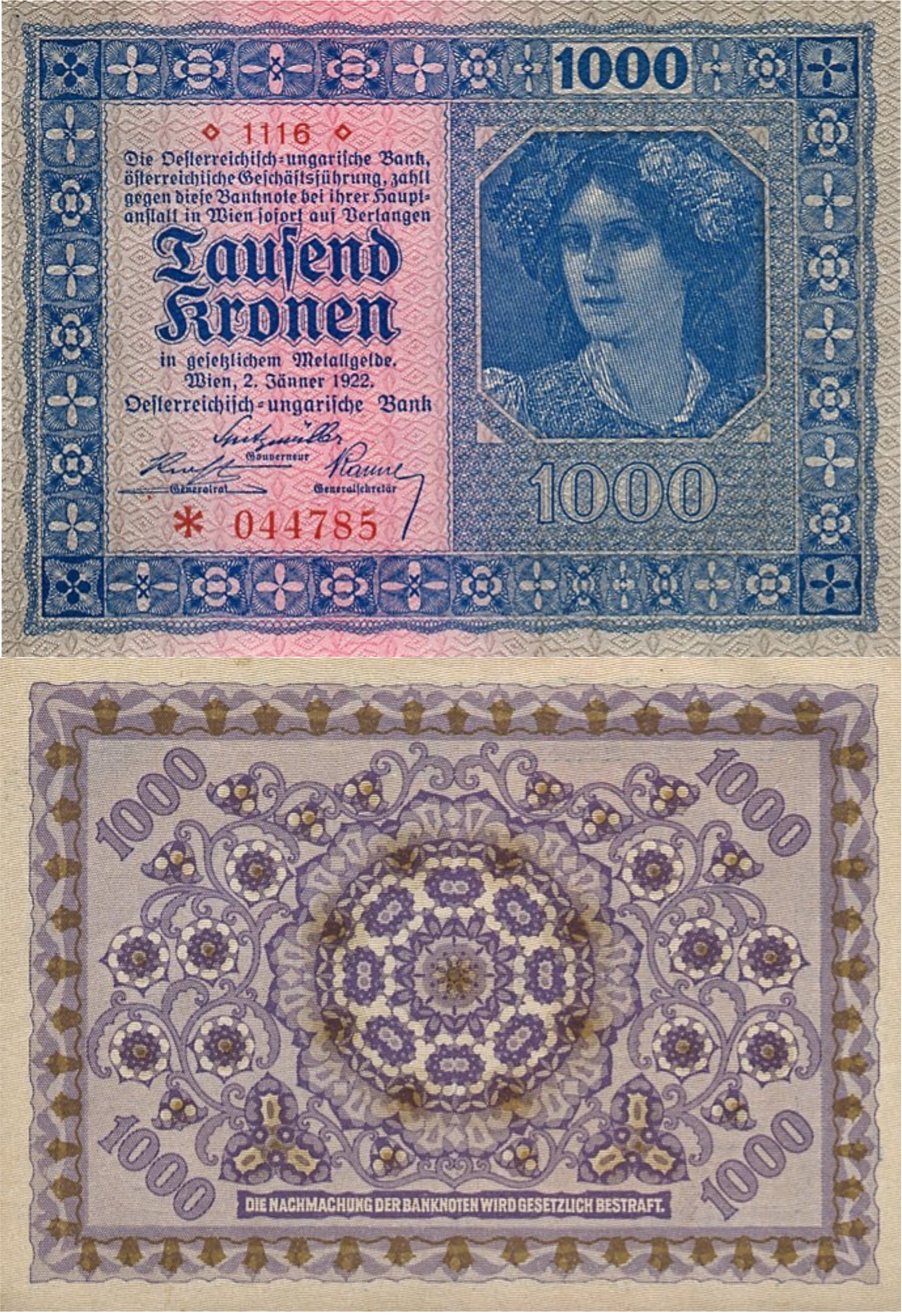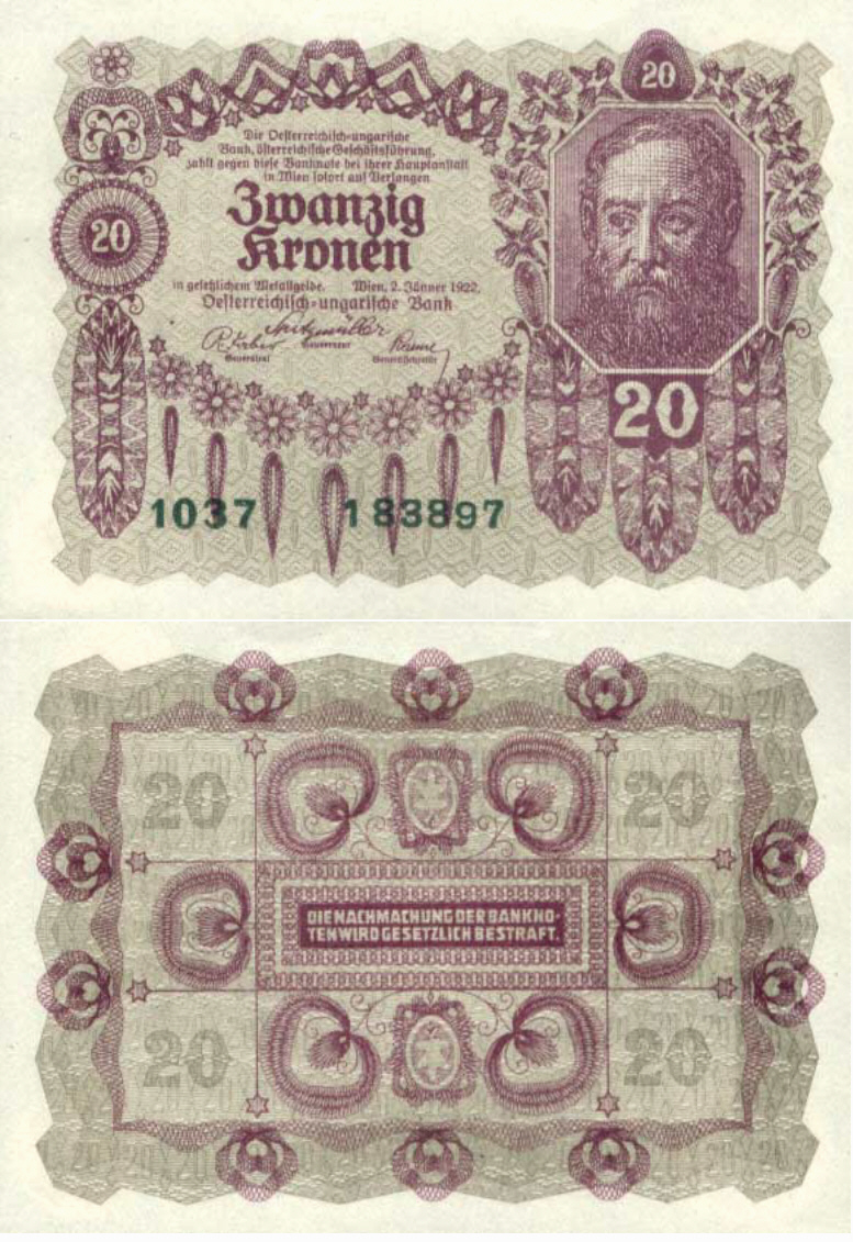 В 1922 году начат выпуск австрийских банкнот, которыми постепенно заменялись австро-венгерские банкноты со штампами. Банкноты по-прежнему выпускались Австро-Венгерским банком, но имели текст только на немецком языке (ранее — основной текст на немецком и венгерском, а номинал банкноты также на итальянском, румынском, сербском, украинском и др. языках империи), с указанием места выпуска — Вена (ранее указывался также Будапешт).