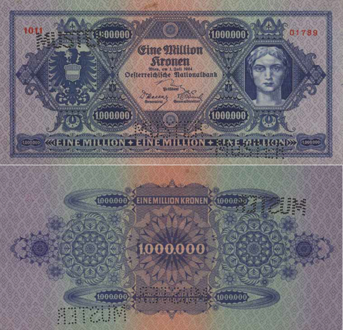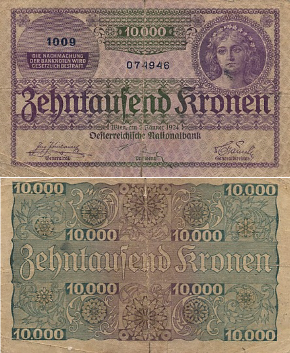 В 1924 году выпущена была купюра в 10 000 крон Национального банка Австрии — единственная купюра в кронах этого банка, выпущенная в обращение. Эта купюра с надпечаткой «1 шиллинг» некоторое время находилась в обращении после введения австрийского шиллинга[3].