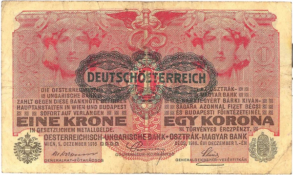 12 марта 1919 года было произведено штемпелевание банкнот Австро-Венгерского банка штампом «DEUTSCHÖSTERREICH». В 1920 году были выпущены австро-венгерские банкноты с другим видом штампа — «Ausgegeben nach dem 4. Oktober 1920».