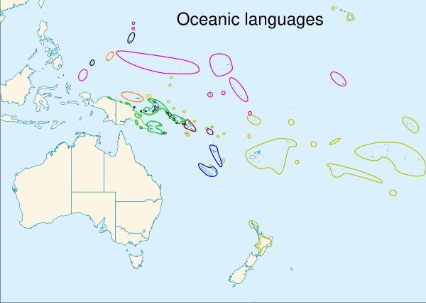 - океанийские языки (около 450 языков в прибрежной части востока Новой Гвинеи и в Океании). Среди последних выделяются восточноокеанийские; в числе которых отдельные подгруппы составляют микронезийские и полинезийские языки.