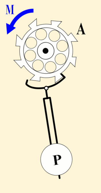Примером такого рода системы может служить храповой механизм маятниковых часов, схема которого представлена на рис. 2. На ось храпового колёса A (которое в этой системе выполняет функцию нелинейного регулятора) действует постоянный момент силы M, передающийся через зубчатую передачу от заводной пружины или от гири. При вращении колёса A его зубцы сообщают кратковременные импульсы силы маятнику P (осциллятору), благодаря которым его колебания не затухают. Кинематика механизма играет роль обратной связи в системе, синхронизируя вращение колёса с колебаниями маятника таким образом, что за полный период колебания колесо поворачивается на угол, соответствующий одному зубцу.