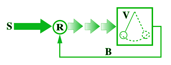 На схеме: S — источник постоянного (непериодического) воздействия; R — нелинейный регулятор, преобразующий постоянное воздействие в переменное (например, в прерывистое во времени), которое и «раскачивает» осциллятор V — колеблющийся элемент (элементы) системы, а колебания осциллятора через обратную связь B управляют работой регулятора R, задавая фазу и частоту его действия. Диссипация (рассеивание энергии) в автоколебательной системе возмещается за счёт поступления в неё энергии из источника постоянного воздействия, благодаря чему автоколебания не затухают.