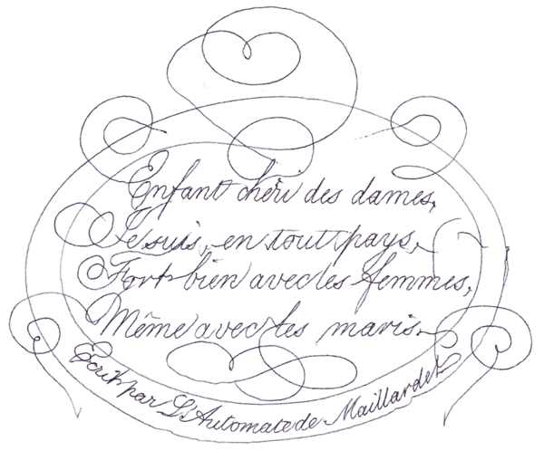 В ноябре 1928 года Институт Франклина получил части латунной машины, поступившие от потомков Джона Пенна Брока, чья семья знала, что когда-то аппарат умел писать и рисовать изображения. Аппарат побывал в пожаре, и его восстановление потребовало значительных усилий. Семья Брок считала, что машина была изготовлена во Франции изобретателем по имени Мельцель. Первоначальный пишущий инструмент — перо или кисть — был заменён на стильографическую авторучку. После ремонта автоматон вновь начал создавать сложные рисунки и стихотворения. На бордюре последнего стихотворения он вывел надпись: Ecrit par L’Automate de Maillardet («Написано автоматоном Майярде»)[1].