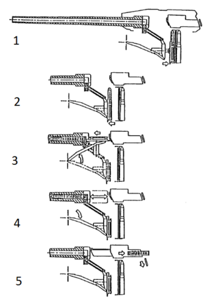 Карусельный автомат заряжания с унитарным патроном работает в пять шагов: