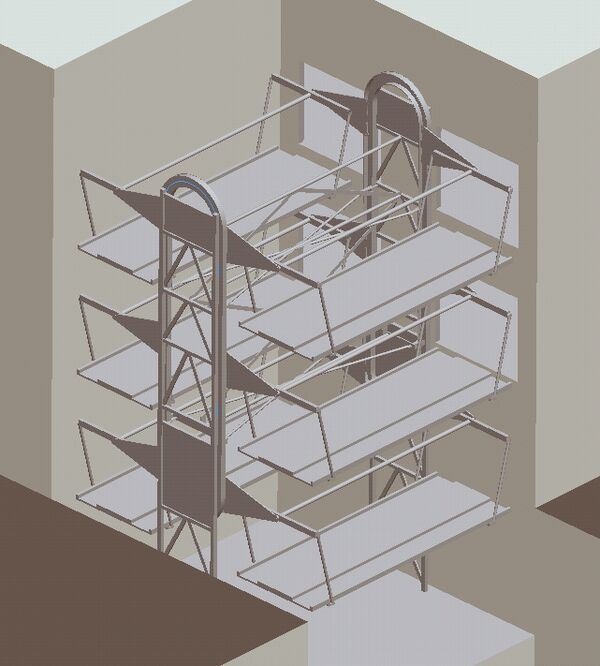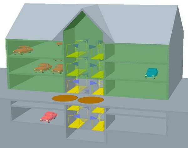 В зависимости от планировки здания гаражного комплекса возможно размещение АПЭТ как в специальной шахте здания, так и в виде пристройки к зданию с соответствующим устройством проездных проёмов в стенах здания. Если в первом случае возможно опирание АПЭТ на элементы здания со всех четырёх сторон, то во втором случае – лишь с одной стороны, с других же сторон и со стороны крыши АПЭТ подвержен воздействиям окружающей среды.