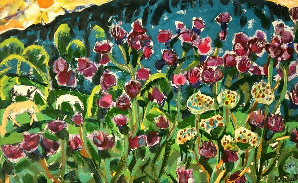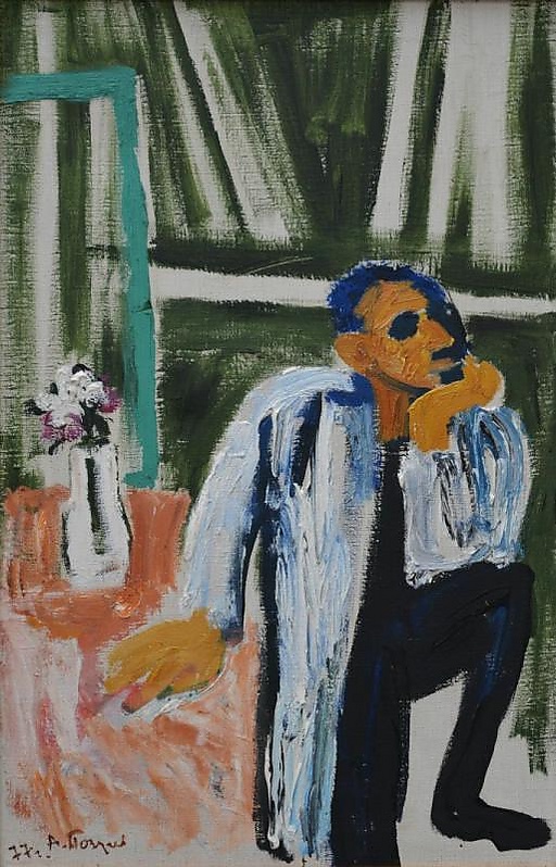 В композиции преобладает условное изображение мужчины, стоящего на одном колене. Левая рука фигуры поддерживает голову, правая лежит на столе. За персонажем расположены полки с вертикально стоящими картинами, что создаёт ощущение пространства художественной мастерской. На столе размещена белая ваза с цветами.