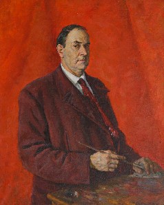 Картина представляет собой поясное изображение на насыщенном красном фоне. Лицо изображённого развернуто в три четверти, корпус и голова обращены вправо. Он одет в тёмный пиджак, белую сорочку и галстук. В правой руке находится кисть, левая рука лежит на её кончике. В правом нижнем углу композиции расположен столик с палитрой.