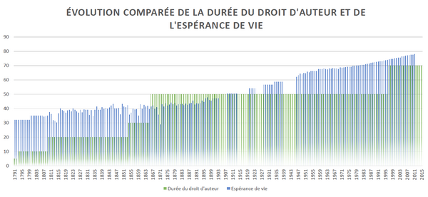 Во время Великой французской революции, все привилегии были отменены, но права авторов были защищены семью законами, принятыми в период 1791—1793 годов, которые оставались в силе до 1957 года. Законы от 13[3] и 19 января 1791 года предоставляют драматургам монополию на представление их произведений, авторские права предоставляются в течение жизни автора и сохраняются на пять лет после его смерти в интересах его иждивенцев. Закон от 19[4] и 24 июля 1793 года распространяет монополию на всех авторов (всех жанров, не только драматургов) и продлевает срок защиты до десяти лет после смерти автора. Закон от 14 июля 1866 года увеличивает этот период до пятидесяти лет после смерти. В течение этого периода, личные неимущественные права создаются на основе прецедентного права в целях сохранения связи между автором и его работой.