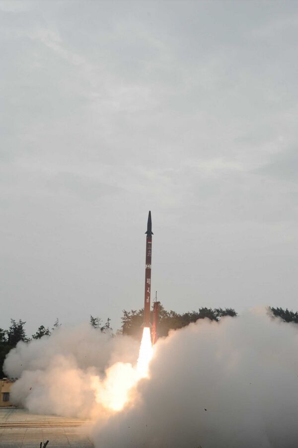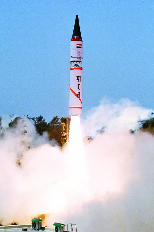 - 19 апреля 2012 — успешно. Ракета стартовала со стартовой площадки в штате Орисса на западном побережье Индии в 08:05 по местному времени (06:35 по московскому времени). Поднявшись на высоту более 600 км, все три ступени отработали нормально и ракета поразила намеченную цель где-то рядом с Индонезией. «После этих испытаний Индия стала крупнейшей ракетной державой», — сказал руководитель ДРДО Виджай Кумар Сарасват телеканалу Times Now. Успех испытаний подтвердил и руководитель проекта Авинаш Чандра: «Мы в точности получили желаемые результаты». Испытания Agni-V неоднократно переносились. Первоначально предполагалось провести запуск новой ракеты в 2010 году. Затем испытания были перенесены на 2011 год. На данный момент (19 апреля 2012 года) известно, что ракеты дальностью 5000 км есть только у Китая, России, Франции, США и Великобритании. Предполагается, что такие ракеты есть и у Израиля, однако это государство данные о своих вооружениях не раскрывает[3][18][19]