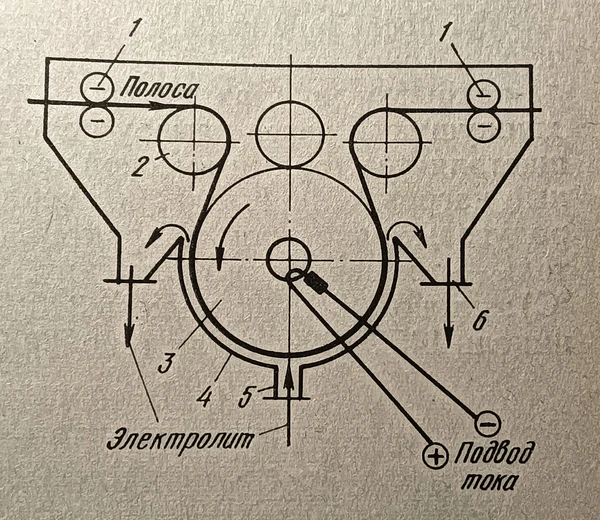 Агрегат непрерывного электролитического цинкования (АНЭЦ) имеет состав вспомогательного оборудования в целом близкий к агрегату непрерывного горячего цинкования, в том числе установки для очистки (обезжиривания) поверхности полосы в горячем щелочном растворе и для травления в растворе серной или соляной кислоты. Основные различия заключены в конструкции и принципе работы цинковальной ванны[3]. Эта ванна имеет цилиндрическую форму и изнутри покрыта листом из свинцового сплава, представляющим собой анод. Внутри ванны вращается токоподводящий приводной медный барабан диаметром 1500 мм с хромированной поверхностью (это катод).