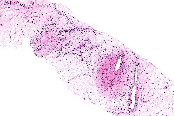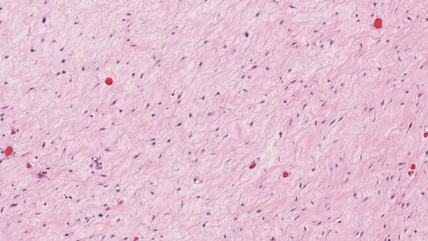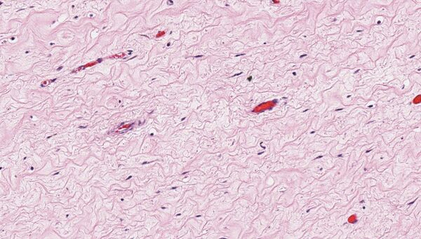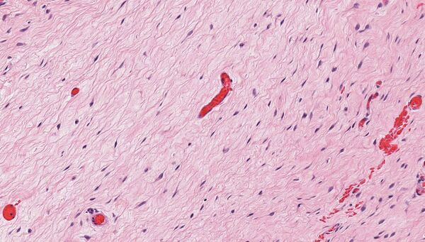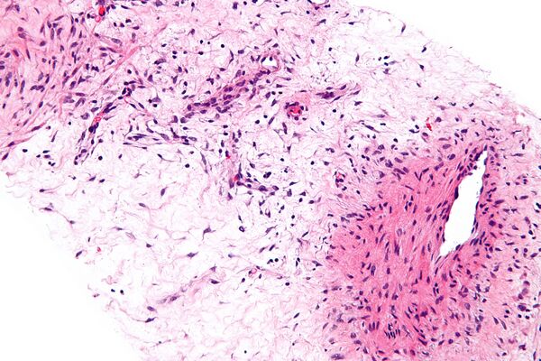 Гистологическое исследование выявляет опухоль, состоящую из бледной или эозинофильной стромы, содержащей многочисленные беспорядочно расположенные кровеносные сосуды, которые выделяются на миксоидном фоне. Размер сосудов варьирует от тонкостенных капилляров и венул до более крупных артерий. Строма имеет выраженный миксоидный характер с включёнными тонкими коллагеновыми фибриллами, гладкомышечными пучками и экстравазированными эритроцитами. Часто наблюдается инфильтрация мягких тканей, характеризующаяся вовлечением мышц, нервов и жировой ткани[2].