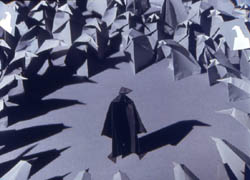 По местности идет толпа серых бумажных журавликов. Их сдувает ветер с песком, они погибают. Но тут появляется Белый журавлик и спасает их, закрывая собой от ветра. После того, как опасная зона пройдена, толпа замечает, что спаситель не такой, как они. Бумажки решают запятнать его грязью и сделать таким же, как они. После ряда неудачных попыток неблагодарные серые журавли убивают своего спасителя, разорвав его на части. Но Белый собирается и возносится на небо, от чего оно из серого становится голубым и светлым. Бумажные журавли продолжают свой путь, неся портреты Белого, но тут появляется другой не похожий на них журавлик, только теперь Чёрный, и на него смотрят тем же взглядом, что сперва на Белого.