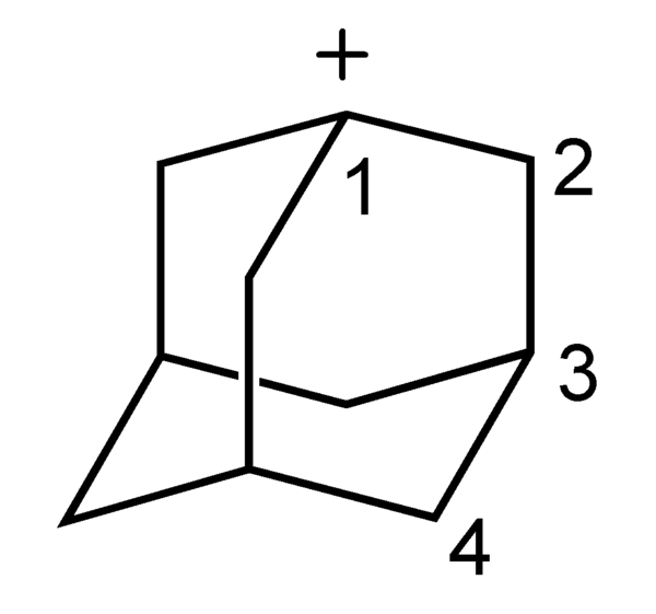 1-адамантил-катион обладает высокой стабильностью по сравнению с другими третичными карбокатионами. Он легко образуется в результате взаимодействия 1-фтор-адамантана с SbF5.[21]