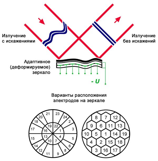 Адаптивное (деформируемое) зеркало является наиболее популярным инструментом для управления волновым фронтом и коррекции оптических аберраций. Идею коррекции волнового фронта составным зеркалом предложил В. П. Линник в 1957 году[2][3]. Возможность создания такой системы появилась с середины 1990-х годов в связи с развитием технологий и с возможностью точнейшего компьютерного управления и контроля.