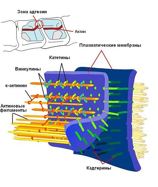 - Адаптером между CAM и элементами цитоскелета выступают внутриклеточные якорные белки, большинство из них крепят цитоплазматическую сторону кадгеринов к актиновым филаментам. Кадгерины непосредственно взаимодействуют с β-катенином и плакоглобином (γ-катенином), который, в свою очередь, присоединяется к молекулам α-катенина, а те — к винкулину, α-актинину или ZO-1, которые уже связываются с актином[3][5]. В комплексе якорных белков с кадгеринами присутствует также белок p120-катенин, который, вероятно, участвует в регуляции силы адгезионных контактов между клетками[2]. Нектины крепятся к актиновым филаментам через белок афадин[4][5].